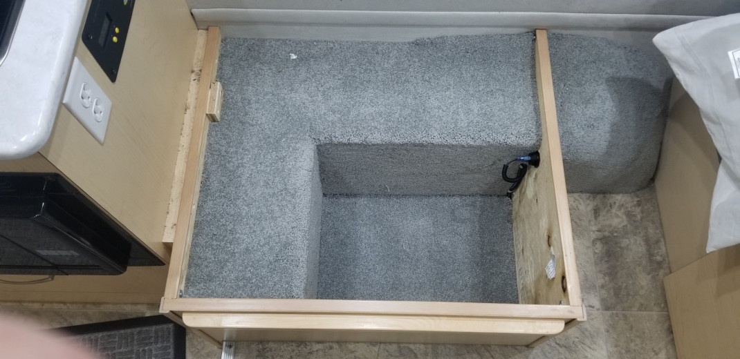 As part of improving our Pleasure Way Lexor TS, one thing we are always after is more storage space. The ottoman on the passenger side had a large storage space that we used to keep extra stuff in. However, there seemed to be a lot of potentially recoverable space so I took it on to investigate. What's behind all that carpet?
